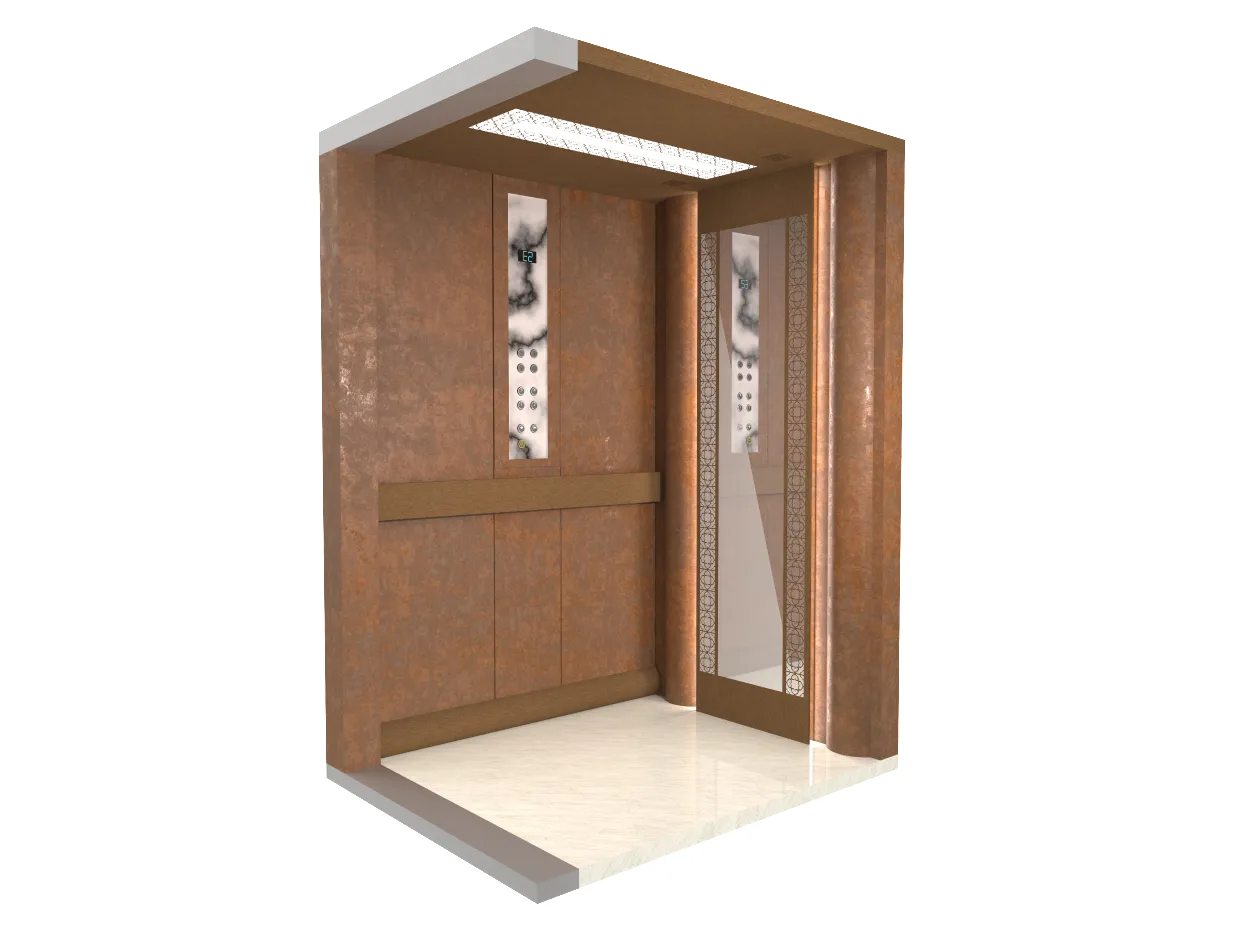 Cuenta con paneles revestidos en chapa galvanizada símil óxido, con base de pintura especial, idénticas propiedades que el acero inoxidable Posee botonera de vidrio, paño de espejo completo de fondo (con guardas en cada lateral), pasamanos rectos en ambos laterales revestidos con el material de los paneles, al igual que los zócalos La iluminación del cielorraso, al igual que el efecto óptico producido detrás del vidrio, es de LED cálida.