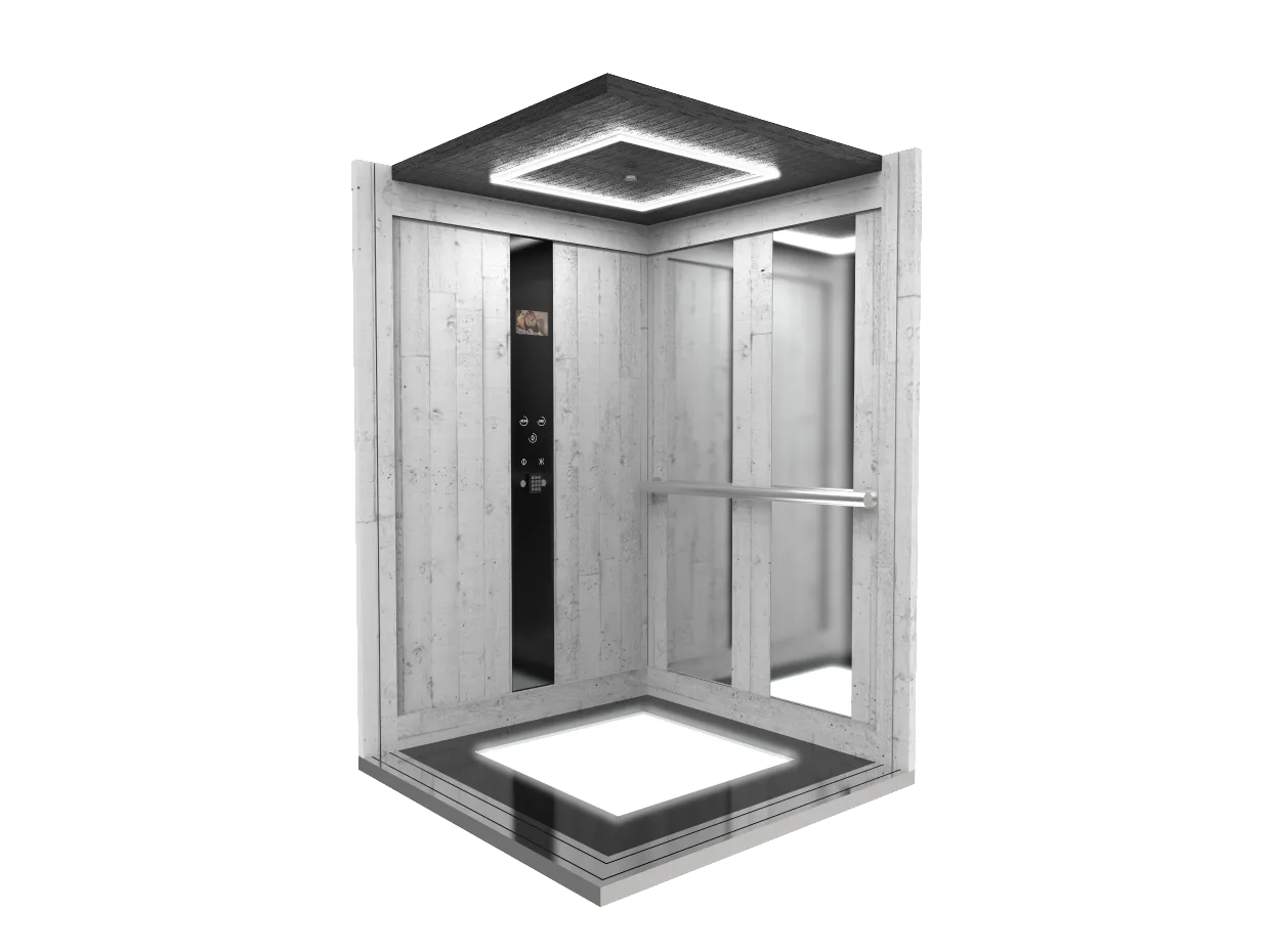 Diseñada para ascensor panorámico. Paño del fondo preparado para colocación de vidrio de seguridad (a pedido del cliente). Pasamanos al centro. Es opcional el revestimiento interior, según como se haya diseñado el pasadizo.